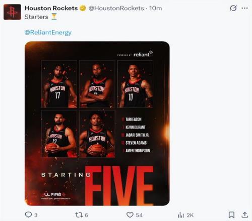 火箭:阿门、杜兰特、伊森、史密斯、亚当斯;