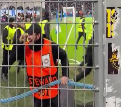 马赛在2-1战胜纽卡后,现场一客队看台前的保安难掩喜悦之情,对纽卡球迷接连做擦眼泪动作,并摇动护栏上的绳索,不时拍胸庆祝、仰面微笑。